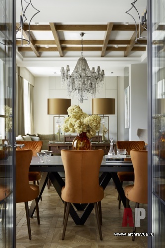 Интерьер квартиры выполнен в стиле сдержанной европейской эклектики с едва уловимыми восточными нотами. Дизайнеры сделали ставку на соединение парадного настроя с легкой и непринужденной атмосферой. Пространство выглядит светлым, просторным, воздушным за счет белых стен, выбеленного дубового паркета, белоснежного лепного декора, которым оформлены стены.