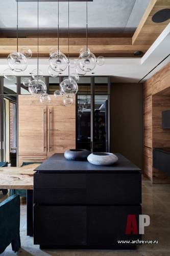 Ключом к декоративному облику интерьера стал кухонный гарнитур немецкой фабрики Eggersmann с брутальными фасадами из шпона дуба в отделке «рустик» и необычной столешницей из черного протравленного гранита: шероховатого, грубого, брутального.