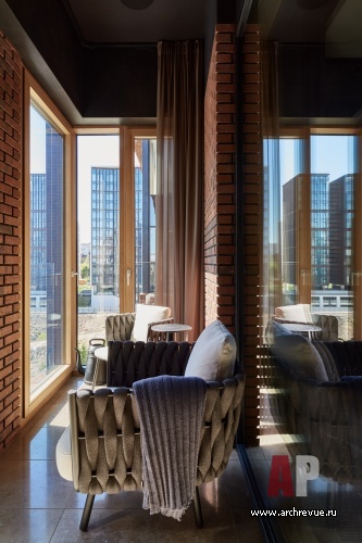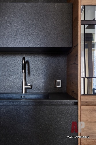 «В поддержку к кухне появился шпон камня с разными видами обработки, которым мы отделали стены в гостиной, камнем же облицована и дверь-невидимка, которая ведет в спальню, - рассказывает автор проекта. – Гладкий мрамор, слэбы травертина с эффектом старения с кавернами и отпечатками микроорганизмов, рельефная каменная мозаика создают ощущение созданной природной поверхности, настраивают на отдых в мегаполисе». С камнем архитектор замиксовала состаренное дерево, на пол постелила оригинальный паркет из дуба, обработанного натуральными кислотами (экологичность – еще одна важная особенность этого интерьера!), потолок оформила бетоном, соединив урбанизм и экологичность. Брутальные фактуры уравновешивает кожа, натуральная замша и бархат - мягкие, уютные, приятные на ощупь. Созданная на нюансах фактур квартира одновременно напоминает модернистскую виллу в лесу и модный эко-отель, кроме того природные материалы будут красиво стареть, а значит с годам квартира станет еще ярче и интереснее.