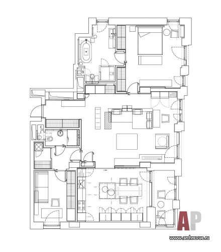 С одной стороны к ней примыкает кухня-столовая, она отделена раздвижной стеклянной перегородкой с переменной прозрачностью, в открытом виде кухня становится продолжением гостевого опен-спейс, с другой стороны – из гостиной организован выход в приватные апартаменты: спальню со смежной ванной комнатой. При входе организованы технические помещения, большая гардеробная и гостевой санузел.