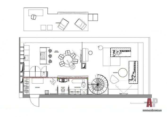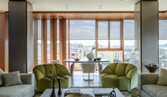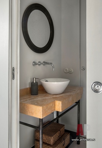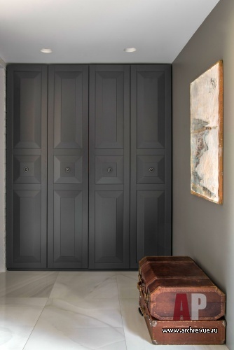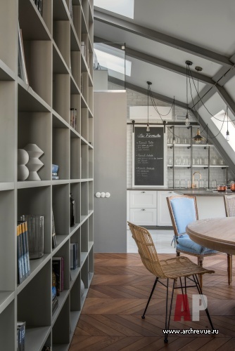 Квартира площадью 154 кв. м имеет три уровня. Вход и парадная зона с гостиной, столовой и кухней (общими помещениями дневного пребывания) организованы на верхнем мансардном этаже. К такому решению подтолкнул сложный исходный объем с большой высотой мансарды и великолепными мансардными окнами, откуда открывается вид на историческую застройку Москвы. При входе расположена прихожая, гостевой санузел и постирочная.