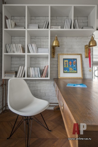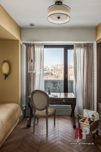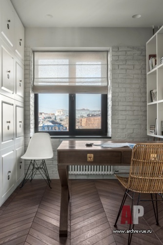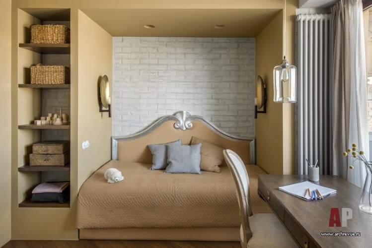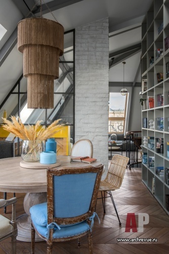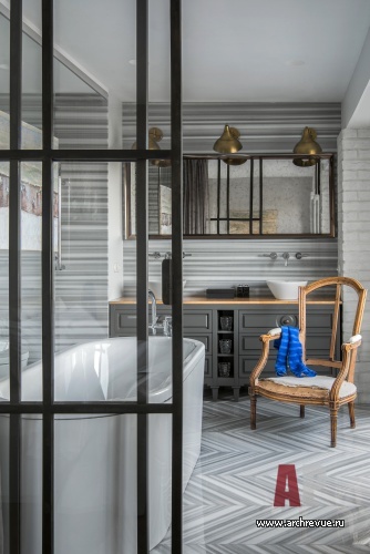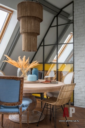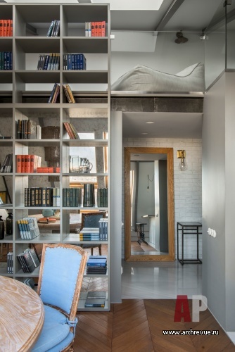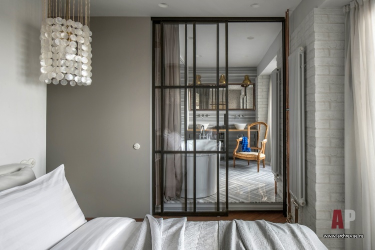 Интерьер семейной квартиры исполнен как свободный микс из элементов стиля лофт и романтичной неоклассики в духе мансардных квартир Парижа и Санкт-Петербурга, где на первый план выходит бескрайнее небо, врывающееся в интерьер через высокие окна. Чтобы сохранит ощущение света и воздуха, родные кирпичные стены дизайнер выкрасила в светлый цвет, а вместо глухих перегородок использовала раздвижные стеклянные перегородки и зеркала.