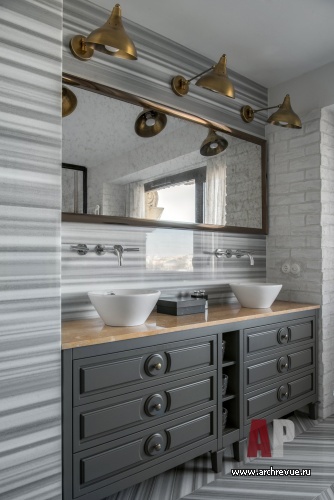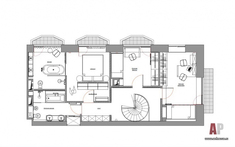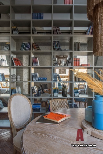 Над ними надстроена небольшая антресоль с рабочим кабинетом и библиотекой хозяина. Остальное пространство мансарды занимает open space – большой, светлый и просторный. Приватные помещения (спальня родителей и две детские – комната дочери и комната двоих сыновей) с личными гардеробными и ванными комнатами расположены на нижнем уровне. Все три уровня связывает винтовая лестница с ажурным ограждением из черного металла.