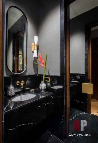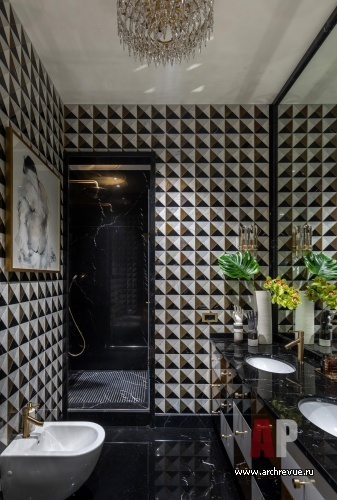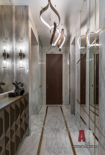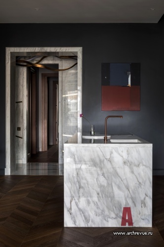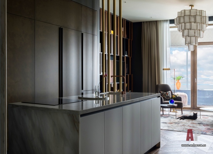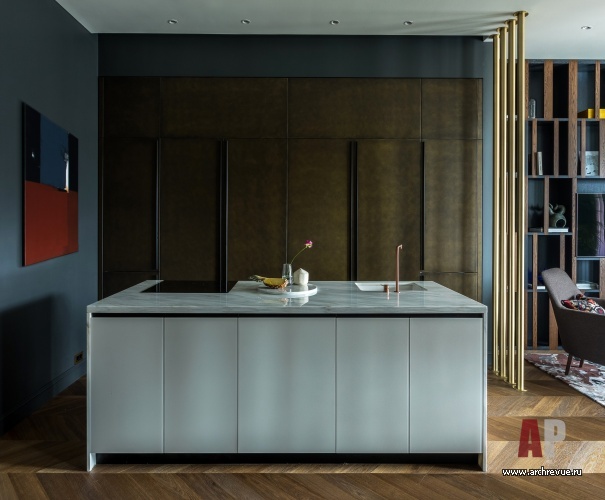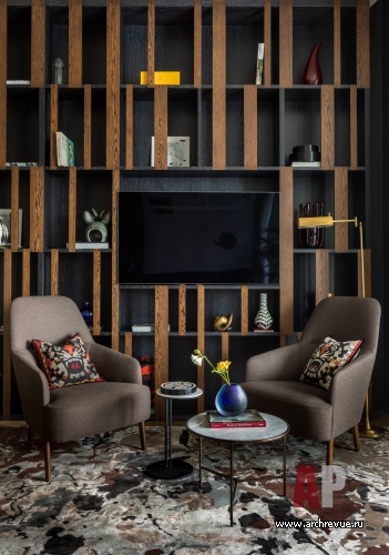Квартира оформлена по принципу микса рациональной базы и яркого экспрессивного декора. Образ комфортного городского интерьера создают качественные натуральные материалы (камень, дерево, металл), а также мебель и декоративные предметы уважаемых европейских брендов. Центральный акцент гостиной – авторский стеллаж из дуба в двух разных вариантах тонировки.