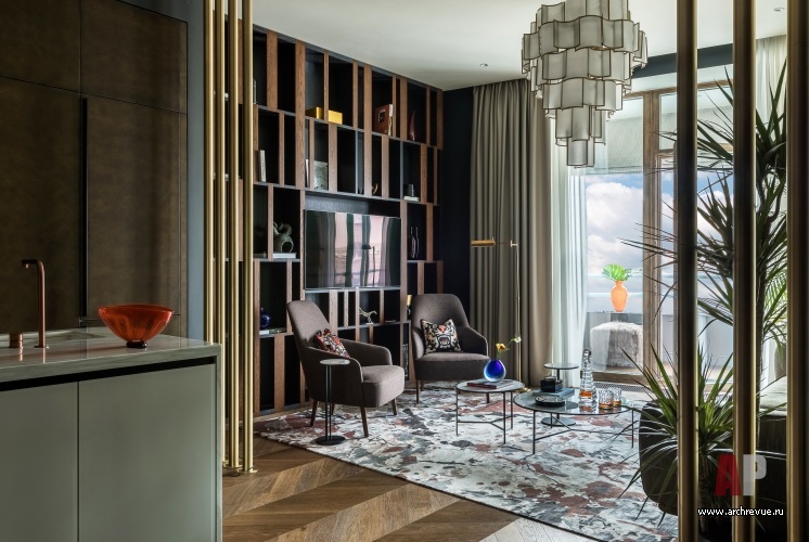 Гостиная диван Giorgetti (модель Drive), кресло Wittmann (модель Mono), столики журнальные Sé Collections (модель Smoke), столики приставные Cattelan Italia (модель Sting); стеллаж, на заказ, по эскизам дизайнера