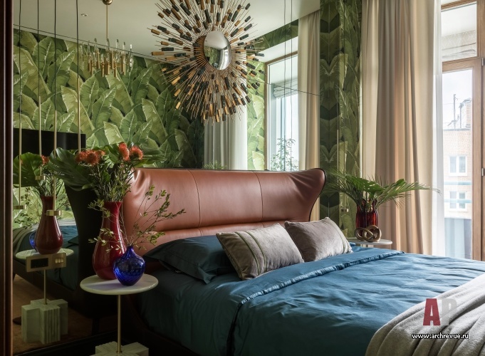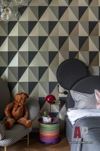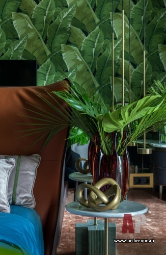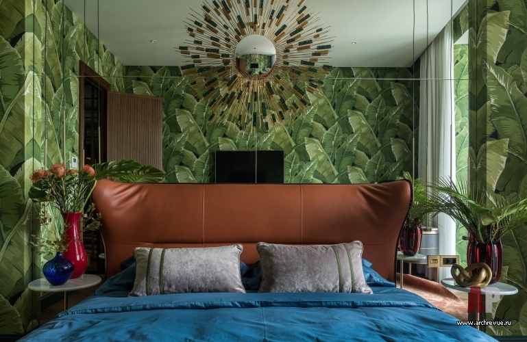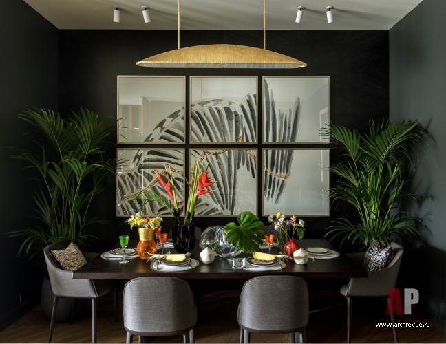 Он делает интерьер интересным и прекрасно соседствует с пестрым текстилем, роскошным панно «Троянский конь» в обеденной зоне и раскидистыми пальмами в кадках у дивана. В приватных помещениях градус яркости повышается: обои с крупными банановыми листьями придают хозяйской спальне сходство с тропическим островом, а яркая геометрия в детских отсылает к искусству поп-арта. Но яркость красок, буйство цветов и фактур – это лишь верхушка айсберга, в основе лежит проверенная классика, поэтому если декор утомит, то надо лишь сменить обои и текстиль – и получится совсем другая жилая среда, но обязательно функциональная и комфортная.