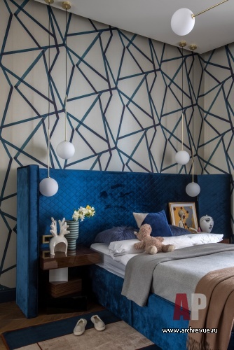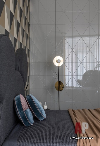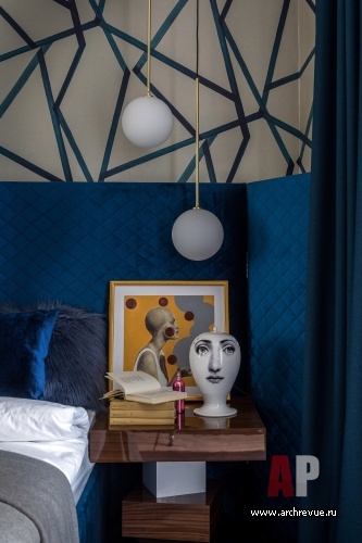 Спальня кровать Poltrona Frau (модель Mamy Blue), туалетный столик Flou (модель Natevo Kara), кресло Baxter (модель Mama Nepal), прикроватные столики Olga Engel Design.