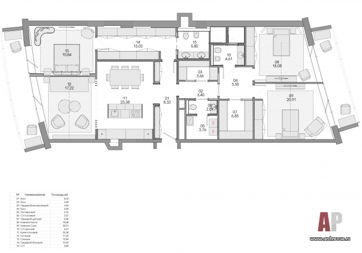 На одной оси со спальней расположена ванная комната. Детская половина отгорожена откатной дверью и решена как почти автономная система с двумя спальнями, отдельным санузлом, гардеробной и лоджией, куда вынесены рабочие места. Благодаря панорамному остеклению квартира имеет хорошую инсоляцию, естественный свет прекрасно проникает в центральный темный холл и дает ощущение большого цельного объема.