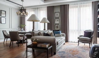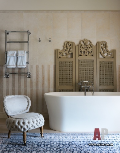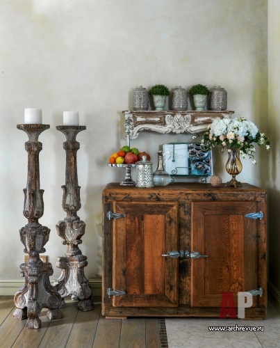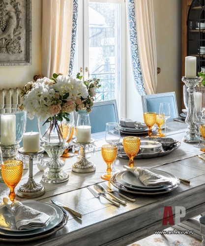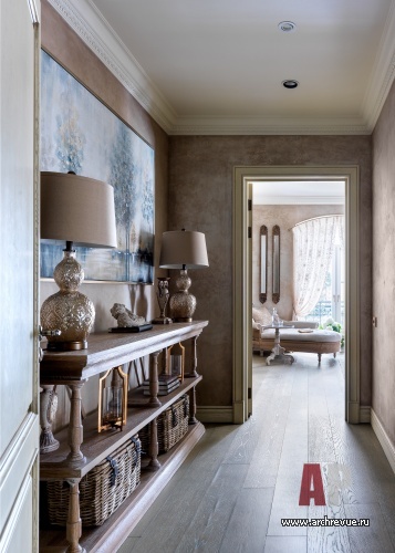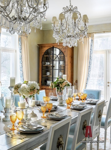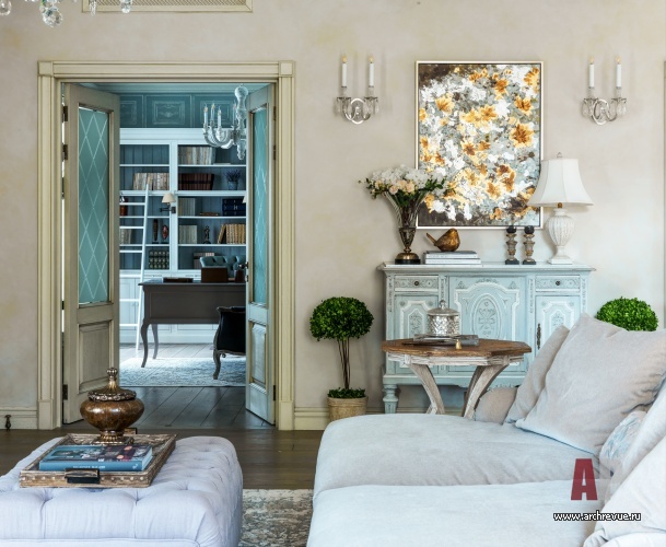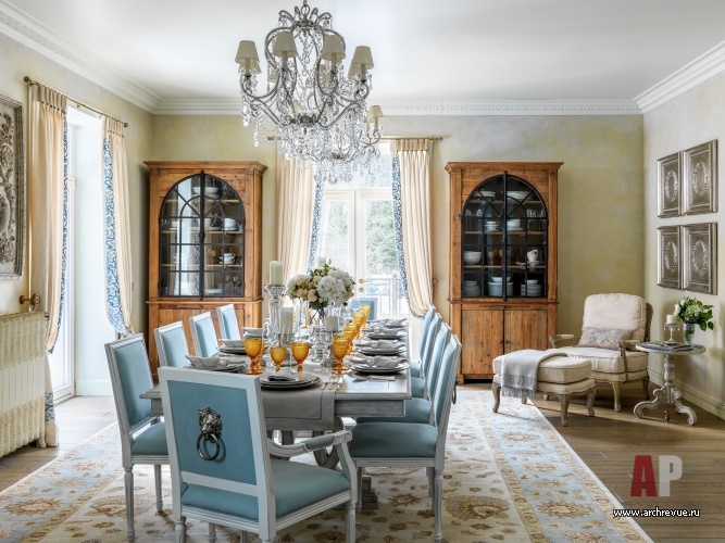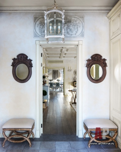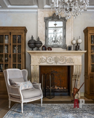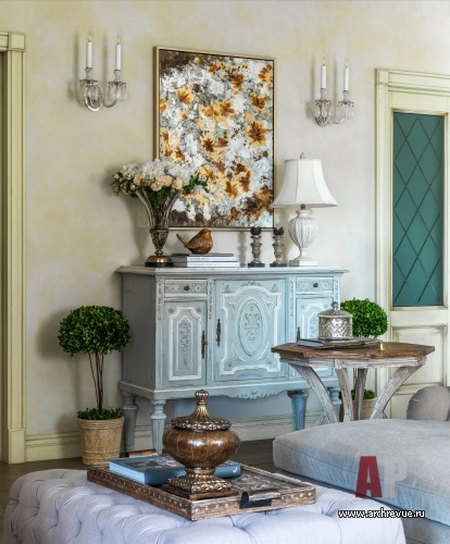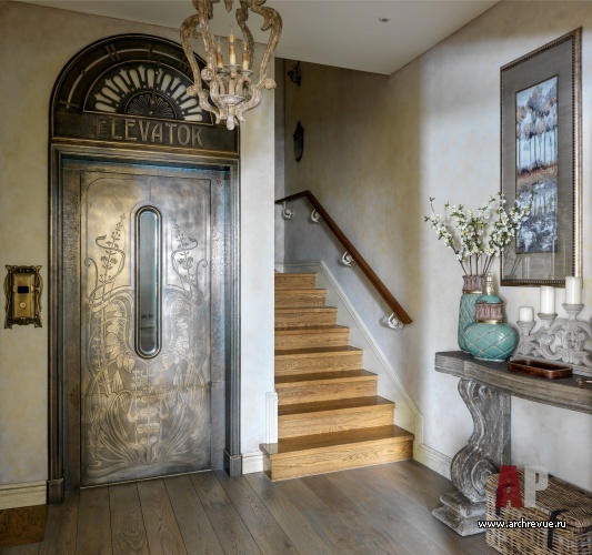 «Заказчики любят путешествовать, им импонируют американские интерьеры, а также французская классика, стиль Прованс, - рассказывают авторы проекта. – Поэтому мы предложили вместо скучного интерьера сделать эффектную стилизацию, полную цитат и отсылок к истории». Работа над проектом началась с одного помещения, но результат настолько понравился владельцам, что они пустились в авантюрный эксперимент по обновлению всего дома. Сложность заключалась в том, что реконструкцию следовало проводить максимально щадящими способами с сохранением исходных объемов и фоновых отделочных материалов. Поэтому авторы проекта привлекли большую команду реставраторов, которые исключительно декоративными методами работали над полным обновлением дома.