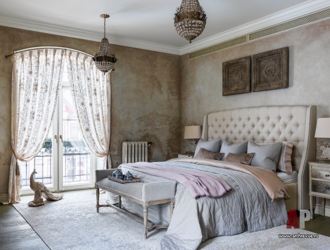 Спальня кровать Ralph Lauren, банкетка, антиквариат, кушетка Restoration Hardware, стол Uttermost и стул Gramercy Home; на заказ