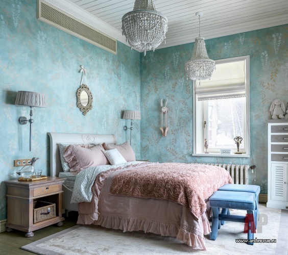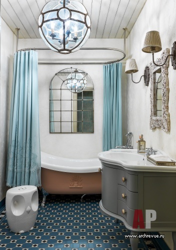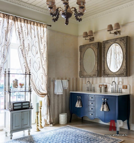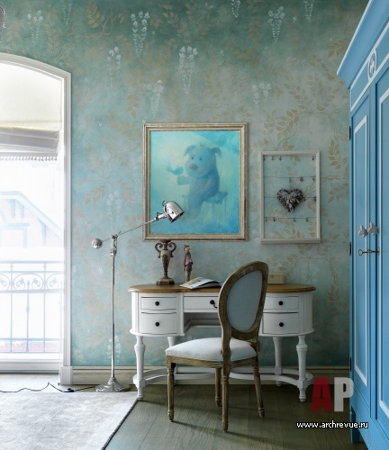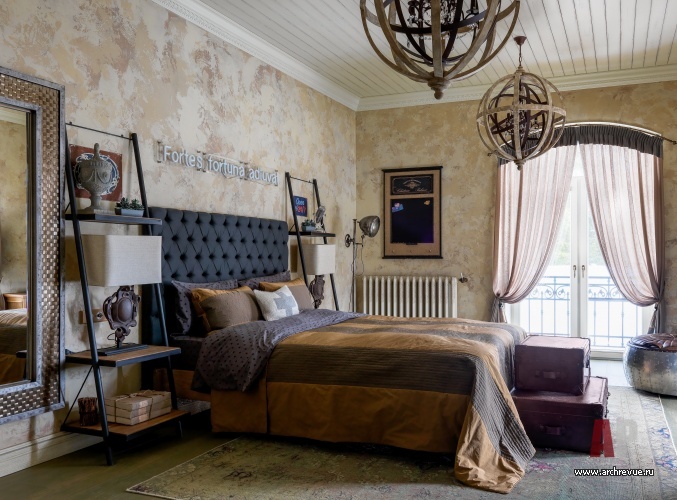 Хозяйская спальня – дань французской классике, спальня дочери в сине-голубых тонах отсылает к дворцовым интерьерам, а помещения в мансарде и комнаты сыновей выглядят более современно: колониальная стилистика с них тесно переплетена с эстетикой лофт и стим-панк. Характерная особенность проекта – потрясающие авторские финишные покрытия, которые меняются от помещения к помещению, но сохраняют ощущение преемственности поколений, семейного поместья. Стены расписаны вручную в многослойной технике с использованием искусственного старения и трафаретной печати. Кессонные потолки, гипсовые карнизы, деревянные двери и фасады оставшейся от прошлой жизни дома мебели авторы проекта перекрасили и облагородили, заменили фурнитуру, добавили антикварного шарма. Ставку сделали на американские бренды и авторские изделия из дерева и металла. В итоге получился подробный интерьер со сложными фактурами и живописным декором.