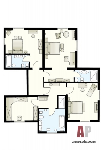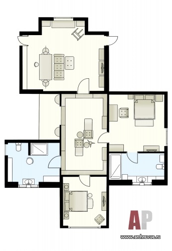 Трехэтажный дом имеет классическую планировку с просторными изолированными помещениями и парадными анфиладами. Из небольшого холла на первом этаже открывается эффектная перспектива остевых пространств: гостиной с каминной зоной и кухни-столовой. К помещениям дневного пребывания семьи примыкает кабинет. На втором уровне расположены три спальни (родительская и две детские) со своими ванными комнатами и гардеробной комнатой.