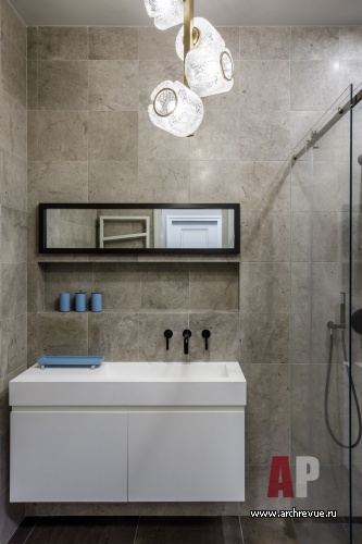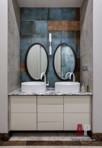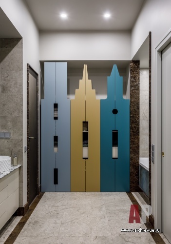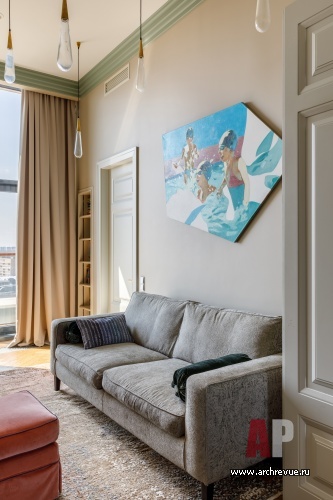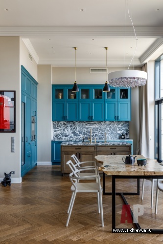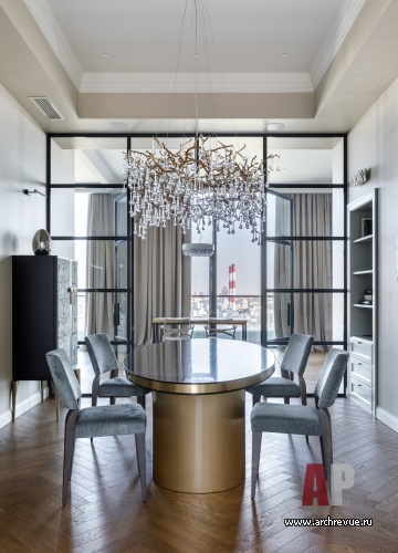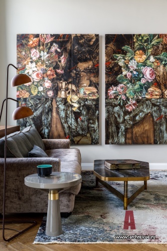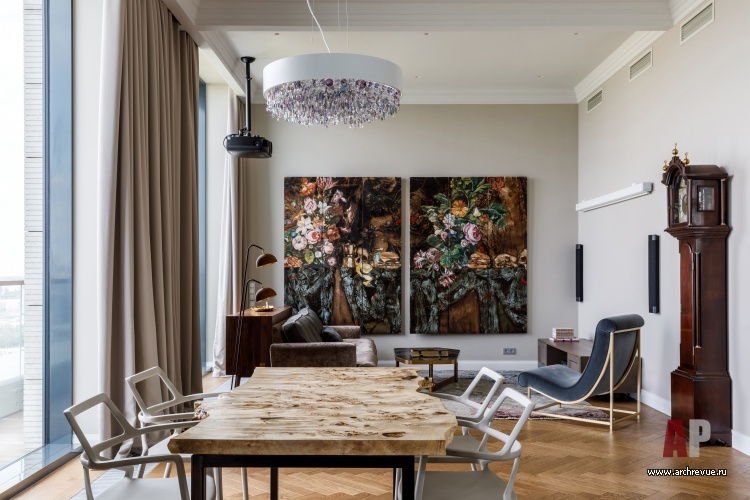 В интерьере часто используется золотая латунь – это перекличка с золотом куполов Новодевичьего монастыря, расположенного рядом, черный сварной металл, фактура натурального дерева. Мебель на заказ здесь гармонирует с предметами европейских фабрик и винтажными аксессуарами. Притом, как всегда, в интерьерах Ирины Крашенинниковой, в проекте много оригинальных, редких на российском рынке изделий небольших фабрик: например, необычные люстры-косы или светильники-капли. Особую роль играет искусство, которое своей плотной колористикой и большими размерами задает масштаб и по-хорошему «заземляет» парящий в небе интерьер.