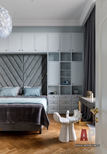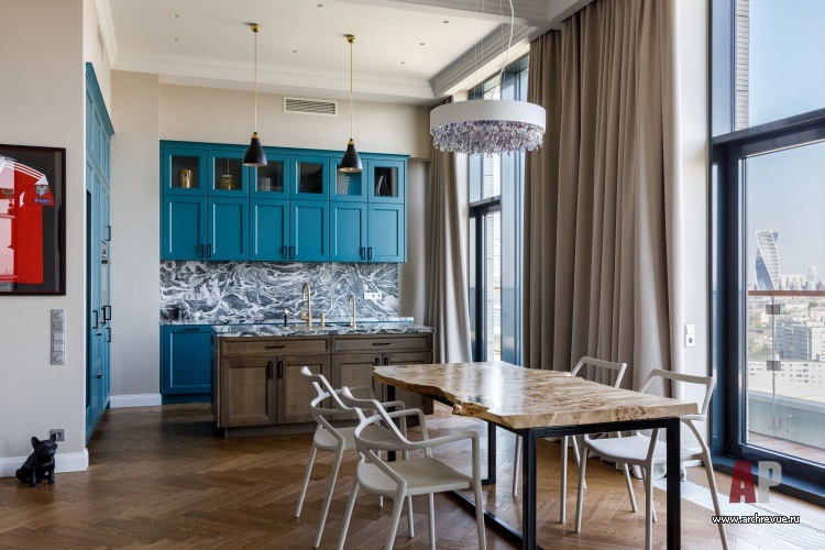 Ключом к декоративному образу пентхауса стала палитра московского неба: прохладные жемчужно-серые и серо-голубые оттенки объединяют все без исключения помещения. Так, например, для фасадов кухни выбран насыщенный цвет, сочетающийся с сине-зелеными башнями Сити, которые видны из окна кухни.