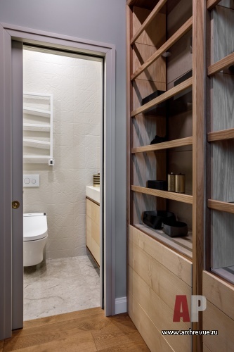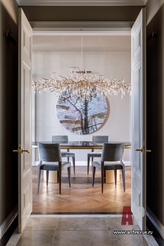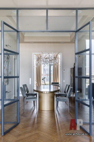 Дизайнер предложила впустить небо внутрь и создать пространство, которое работает на просвет. Для этого выстроила анфилады, которые пересекаются друг с другом и создают интересные перспективы. Функционально квартира разделена на два блока: общую гостиную с кухней и приватную анфиладу, которая включает малую (детскую) гостиную и спальные комнаты. По центру объема находится парадная столовая: из помещения с тремя дверями отлично просматриваются жилые зоны, которые воспринимаются как цельная интерьерная композиция, и московские виды, от края до края… У спальни родителей есть собственная гардеробная и санузел. В детский санузел и постирочную можно попасть через служебный коридор. При входе в квартиру находится гостевой санузел и просторная гардеробная.