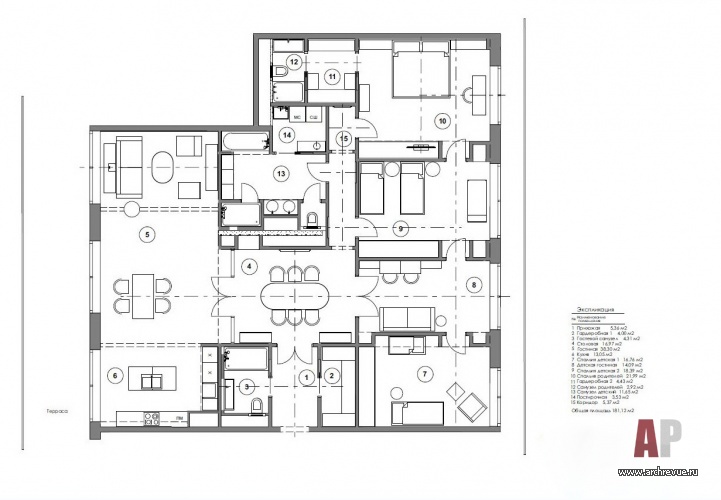 Техническое задание включало создание трех спален (родительской и двух детских), двух гостиных (общей семейной и детской – для игр, занятий и уютного общения), трех санузлов, кухни с обеденной зоной для всей семьи и большой парадной столовой для торжественных приемов. Изначально заказчики хотели нестандартного подхода к планировке, и были готовы к эксперименту.