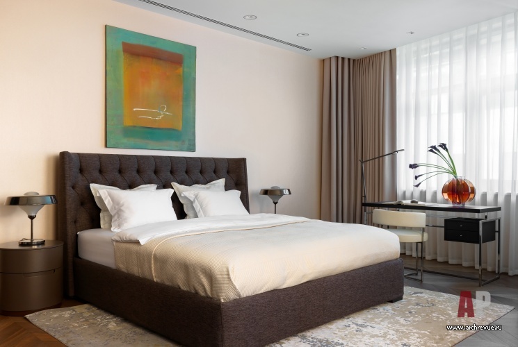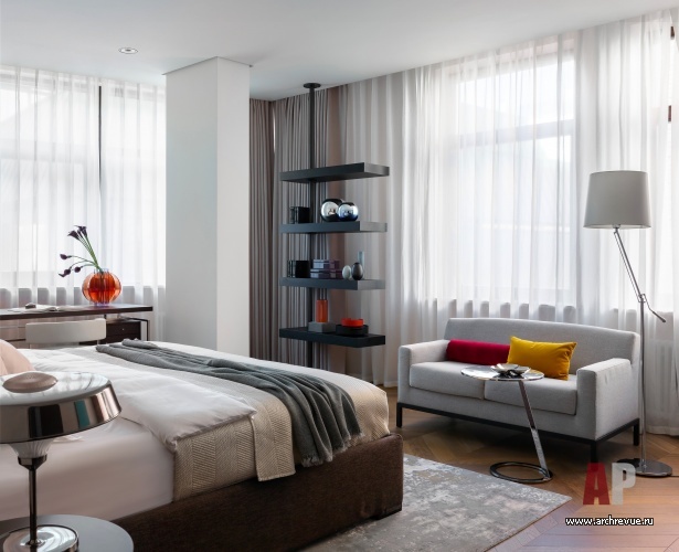 Главная спальня кровать Meritalia, прикроватные тумбочки Presotto Italia, стол, кресло, стеллаж Porada, диван Meridiani
