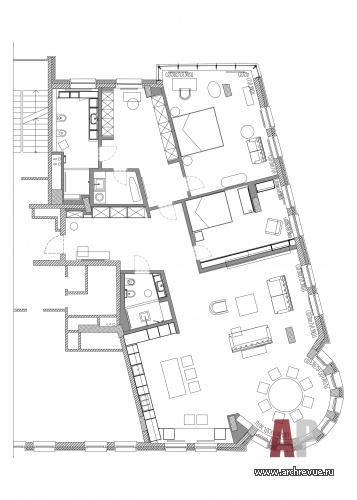 Квартира изначально имела огромное преимущество в виде полукруглого эркера и большого количества окон, однако хаотично расставленные конструктивные пилоны осложняли работу с пространством.
