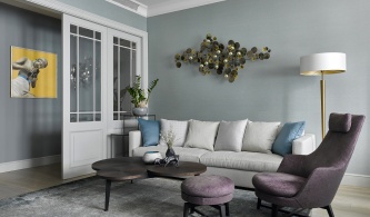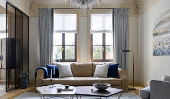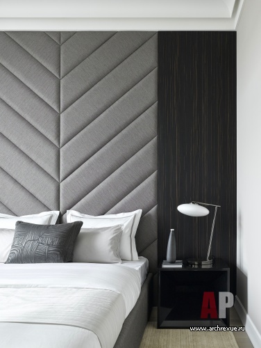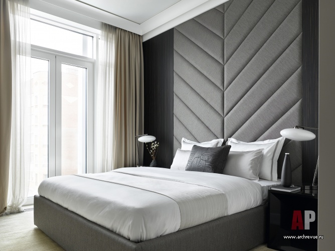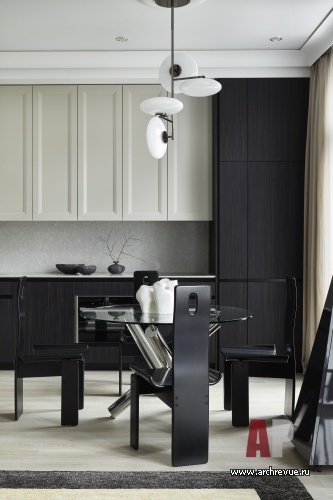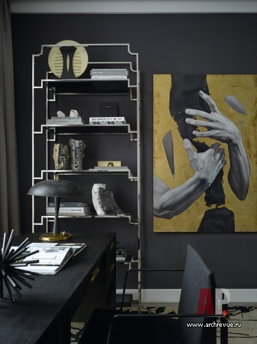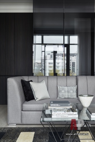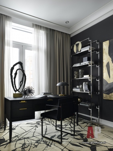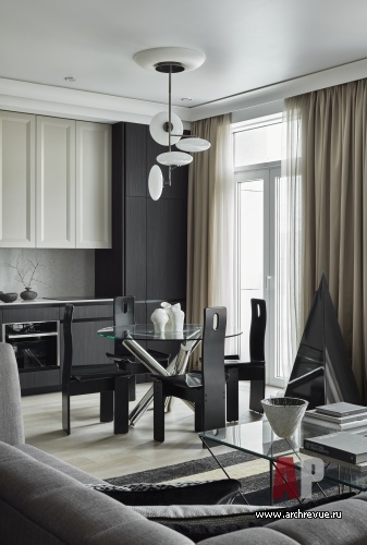 Обычно Наталья Белугина, работая с этим заказчиком, проектирует интерьеры чрезвычайно строгие, минималистичные, с элементами лофта (кирпич, бетон, стекло), но здесь есть классические элементы: например, кухонные шкафы с аккуратными филенками, винтажная мебель (бар-пирамида из темного стекла в гостиной, стулья с волнистыми спинками у обеденного стола). Парадный масштаб гостиной подчеркивают французские окна, обрамленные лаконичными шерстяными портьерами. Черный, серый и белый цвета – основные в цветовой палитре, в гостиной к ним добавляется сложный сине-голубой, в кабинете – золотой. Акцент спальни – кровать с высоким текстильным изголовьем, которое не только является символом уюта, но и кардинально меняет восприятие небольшого пространства.