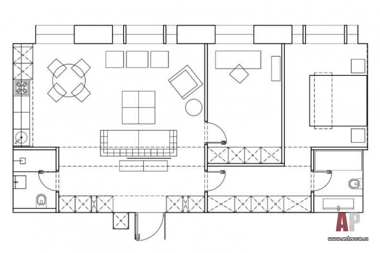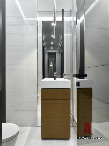 Два санузла находятся в удаленных от окон местах, спальня и хозяйская ванная выделены в самостоятельный блок с внутренним холлом. От прихожей он отделен раздвижными дверями, в открытом виде двери объединяют зоны и открывают интересную перспективу, отчего квартира выглядит гораздо больше и просторнее.