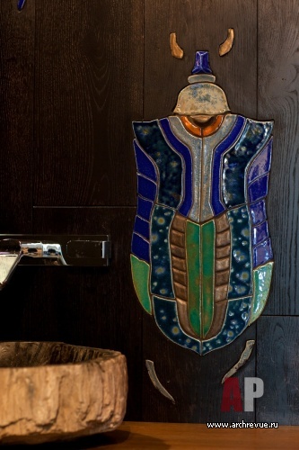 Фоновый лофтовый дизайн дизайнер усложняет нестандартными отделками: декоративной штукатуркой с эффектом ржавого металла, фрагментами старинной кирпичной кладки, напольной плиткой из обожженной глины с вкраплениями смальты и металла. Чем дальше от входа, тем градус эмоций выше: спальню украшают авторские витражи из художественного стекла и состаренных зеркал, хозяйскую ванную комнату – мозаика из смальт-керамики, созданная по мотивам декора Сиенского собора, а в гостевой санузел и вовсе вторгаются гигантские жуки-скарабеи. Они сделаны вручную из цветной керамики и вставлены в стеновые панели из темного дерева. Весь интерьер построен так, что постоянная смена фактур, материалов, образов держат в напряжении, а 74 кв. м по наполненности и декоративному эффекту кажутся куда больше, чем иные загородные дома. Как короткометражка от мастера, в которую укладывается целая киноэпопея.