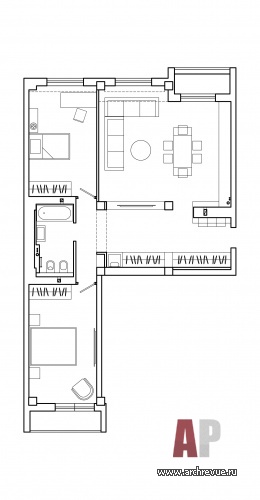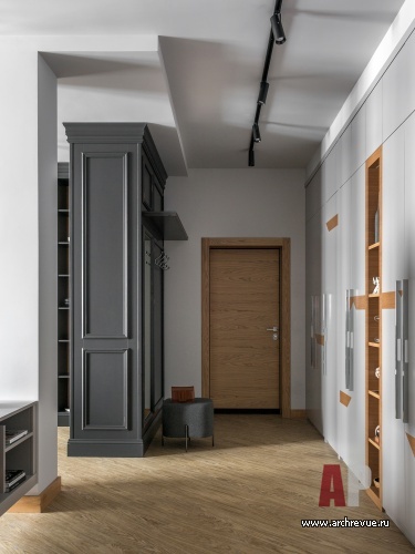 Архитектор Кирилл Егоров вспоминает, что изначально это была типовая квартира со скучной планировкой в монолитном доме. Широкий коридор, много маленьких комнат, большое количество дверей. Поскольку в квартире планировал проживать один человек (в перспективе – молодая семья), он предложил объединить коридор с прихожей, а гостиную с кухней, создав большие открытые помещения.
