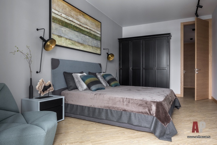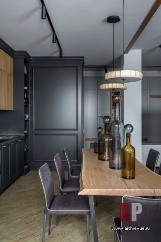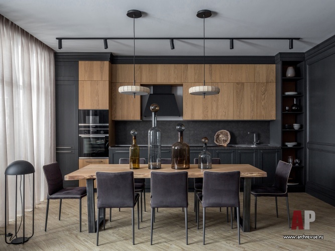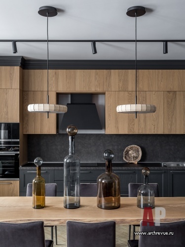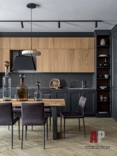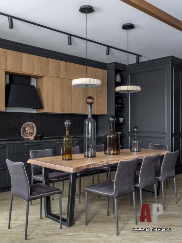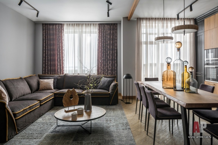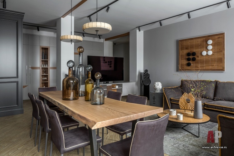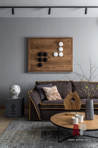 Отделочные материалы выбраны простые и практичные: стены выкрашены однотонной матовой краской серого цвета, на полу жилых помещений – виниловое покрытие с рисунком широкой доски, стены и пол санузла облицованы брутальным серым керамогранитом. Большая часть мебели сделана по эскизам автора проекта: система хранения в холле, комод под ТВ со светлыми фасадами контрастируют с темным деревом кухни и коричневой обивкой углового дивана. Отделка навесных кухонных шкафов шпоном дуба, выполненная из цельного деревянного слэба столешница обеденного стола, открытый технический свет на черных шинах привносит в интерьер едва уловимые нотки лофта. А настенное авторское панно «Го» придает созерцательный характер. Сам архитектор называет проект логовом Степного Волка, в нем идеально соблюден баланс эстетики и брутальности.
