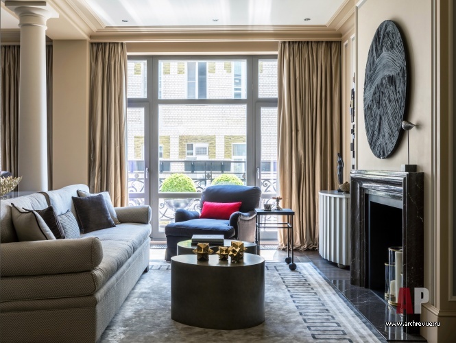 Гостиная диван George Smith в ткани Kirkby Design, кресло Howard & Sons в ткани Dedar, столик у кресла по дизайну Kelly Wearstler, поставщик Lege Alto, журнальные столики Julian Chichester, поставщик GK Concept; комоды, на заказ, по индивидуальным чертежам