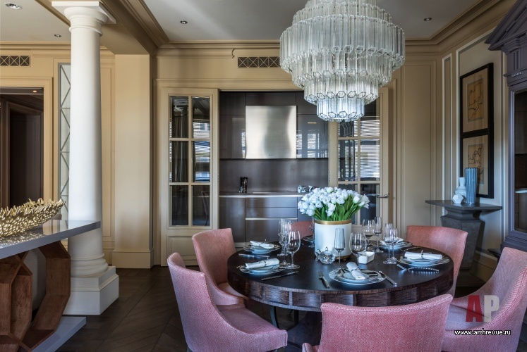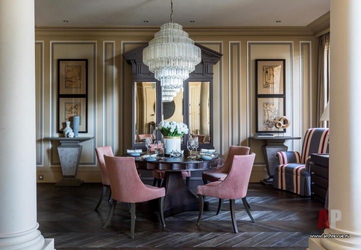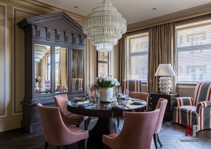 Ставка сделана на природные материалы с благородной фактурой: портал камина выполнен из мрамора Tanji Grey, на полу салона – дубовый паркет с классической укладкой «французская елка». Большая часть мебели в квартире сделана на заказ. Особое внимание привлекает бар-буфет с архитектурным декором в столовой: его фасад украшен классическим портиком и пилястрами, а дверцы выполнены из состаренного зеркала. С ним рифмуются симметричные консоли, облицованные шпоном камня. Круглый обеденный стол также выполнен на заказ, он легко раздвигается и превращается в парадную обеденную группу, где хватит места всем друзьям семьи.
