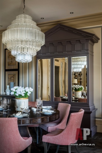 Столовая буфет-бар, обеденный стол с раздвижным механизмом, консоли, тумба, на заказ, по индивидуальным чертежам дизайнера; стулья Lawson Wood в ткани Holland & Sherry, кресла Nina Campbell в ткани Beacon Hill