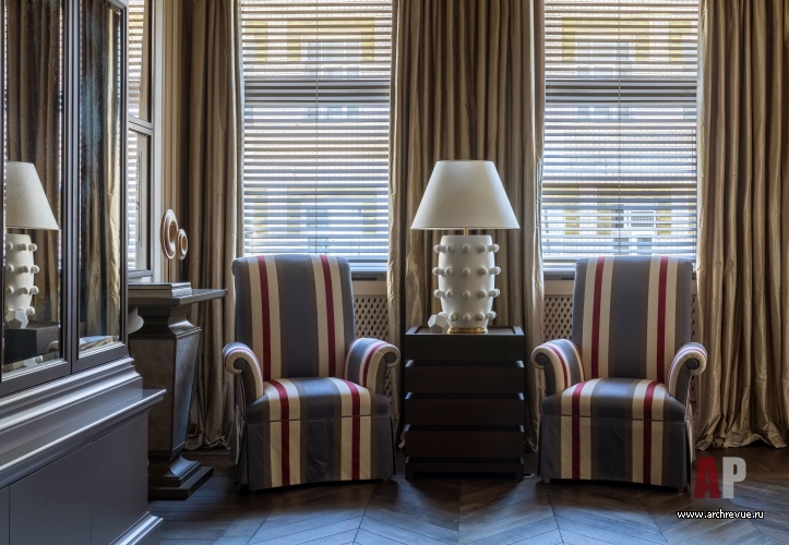 Текстиль на окнах Dedar, Holland & Sherry; отделка панелей алькантарой Holland & Sherry