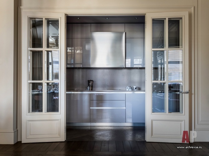 Дизайнер выделила в отдельный блок приватные помещения (хозяйскую спальню и кабинет, в перспективе – детскую, с большой ванной комнатной и гардеробной), спроектировала парадный холл, на одной оси с ним разместила общественный опен-спейс с удобным круговым движением для приема гостей. Единое пространство она разделила декоративными колоннами на зону гостиной-салона с каминной группой и парадную столовую. Функциональную кухню вынесла в нишу и отделила распашными дверьми, все шкафы убрала в скрытые системы хранения и отдельные гардеробные. В итоге получилась комфортная городская квартира для проживания семьи.