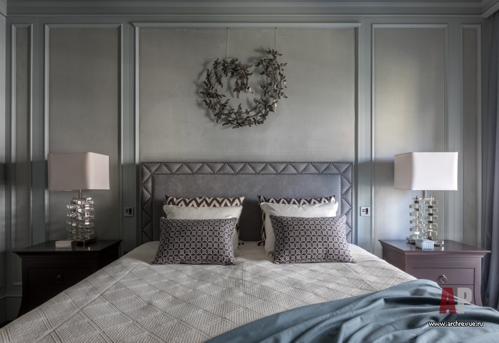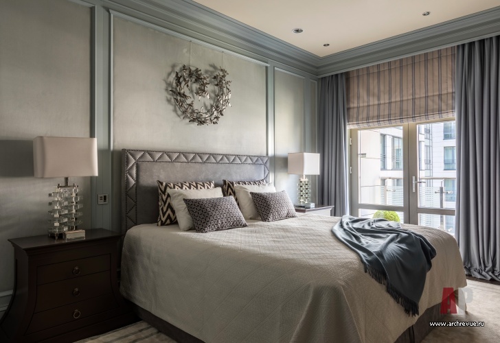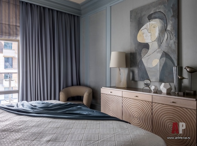 Спальня кровать And so to Bed в ткани алькантара Holland & Sherry; комод, на заказ, по индивидуальным чертежам дизайнера; кресло по дизайну Kelly Wearstler, поставщик Lege Alto