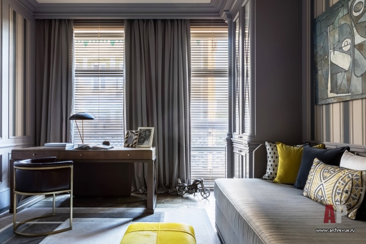 Кабинет-детская диван в ткани Dedar, встроенная мебель, письменный стол, на заказ, по индивидуальным чертежам; меховой пуф, поставщик «Интерьер Mаркет»; стул, поставщик IDC Collection