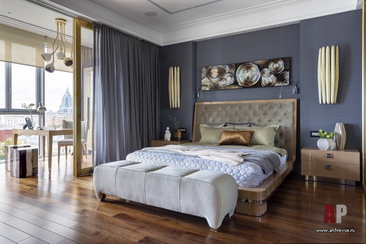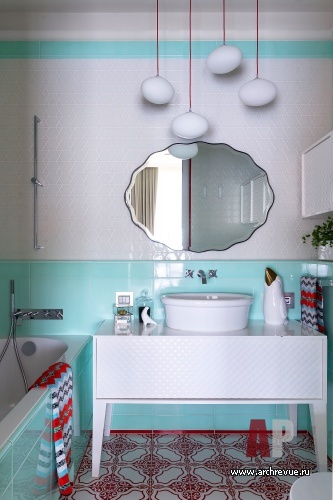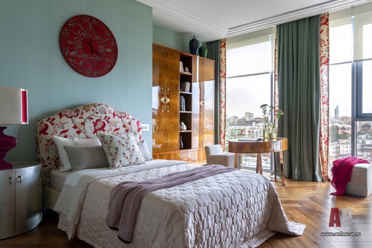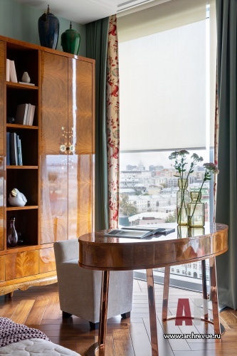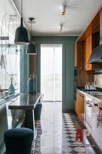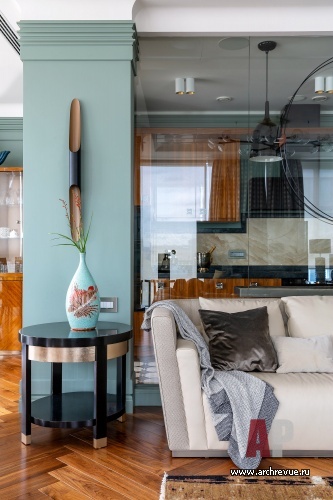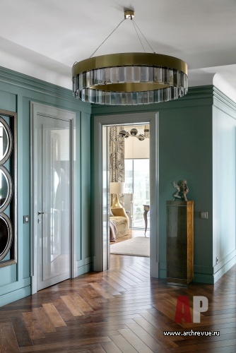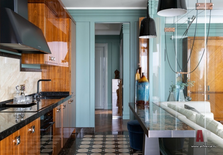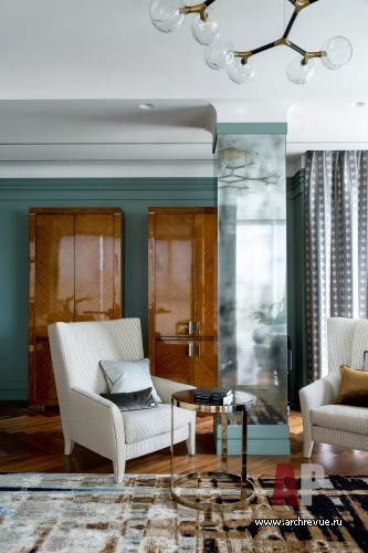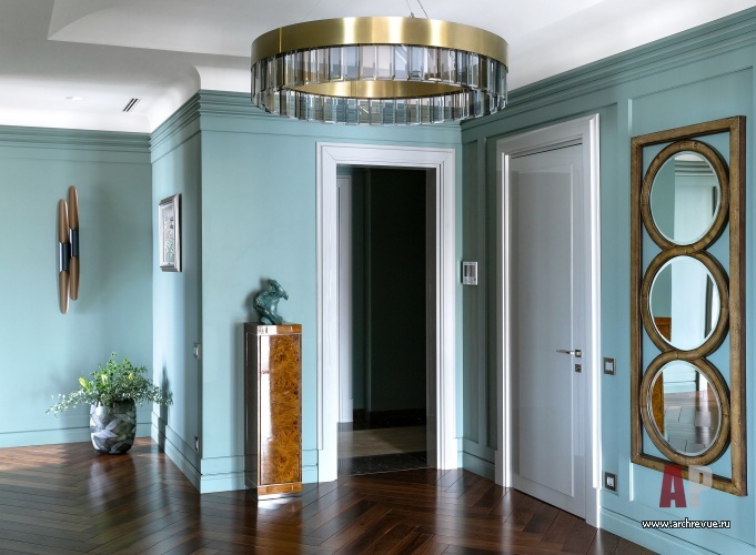 Эстетская квартира с бирюзовыми стенами, патинированными зеркалами и лакированной мебелью в теплых золотисто-медовых оттенках ассоциируется с интерьерами эпохи ар-деко начала ХХ века. Однако сине-зеленый оттенок был взят за основу из чисто прагматичных соображений: панорамные окна квартиры выходят на юго-запад, и летом в помещениях довольно жарко и солнечно, поэтому прохладная гамма психологически помогает снизить температуру.