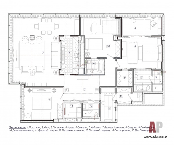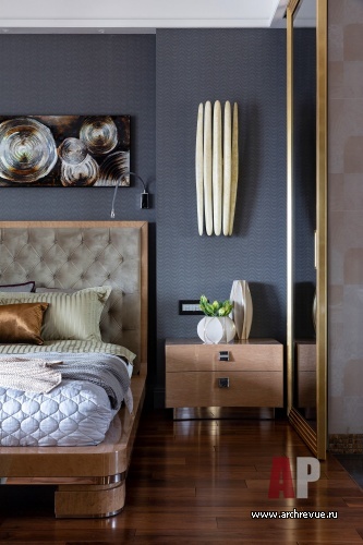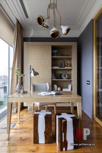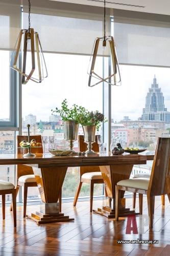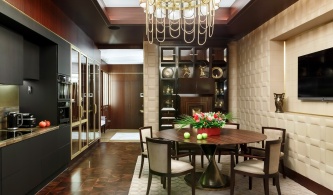 «Заказчики очень любят лакированное дерево, полированный камень, декоративные раскладки шпона, - отмечает автор проекта. – Однако задачи выдержать чистоту стиля совсем не стояло, в процессе работы мы добавляли в интерьер предметы, которые нравились. В итоге получился необычный интерьер, очень индивидуальный и яркий». Еще одной целью стала разработка сложного инженерного проекта с высоким уровнем технического оснащения, которая увеличила сроки сдачи проекта (ремонт длился более двух лет), но обеспечила высочайший уровень комфорта. В квартире установлена инновационная система кондиционирования (чиллер-фанкойл), спроектирована система "Умный дом" с функциями управления светом, отоплением, шторами, оборудован домашний кинотеатр с медиатекой, а также разработана противопожарная и охранная сигнализации. Для всех этих систем спроектирована отдельная серверная комната.