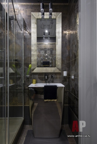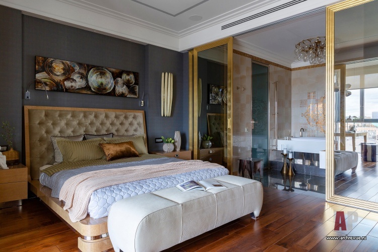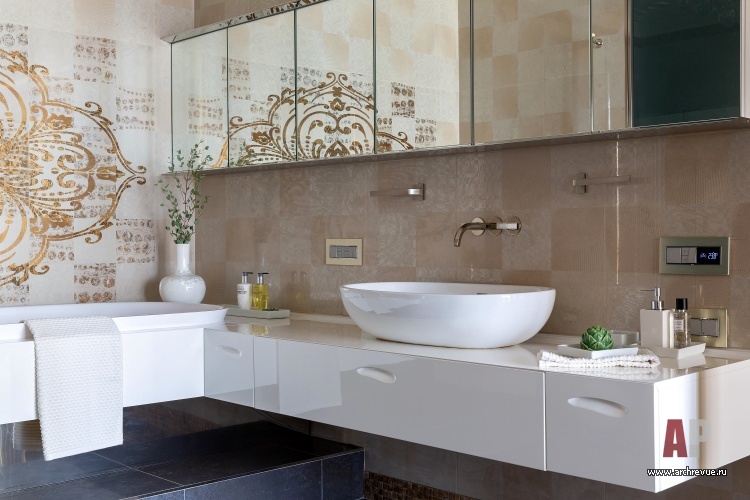 «Заказчикам нравится мебель в стиле ар-деко, которую выпускают современные топовые производители: она вдохновила на использование оригинальных изделий с полированными шпонированными фасадами золотисто-рыжих оттенков», - отмечает дизайнер. С дорогими лакированными отделками сочетается натуральный камень в оформлении мокрых зон, паркет из массива ореха, высокие лепные карнизы, керамическая плитка с золотым орнаментом, светильники с фурнитурой из латуни. Все вместе они создают образ статусного, запоминающегося и очень оригинального интерьера.