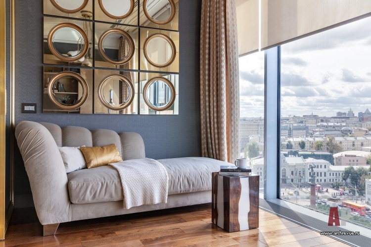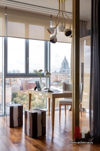 Квартира площадью 209 кв. м. сдавалась в бетоне. «Наличие углового остекления в гостиной (две стены из четырех – панорамный вид на Москву) сделало огромную панораму полноценным элементом интерьера», – рассказывает автор проекта. Панорамное окно присутствует в каждом жилом помещении: общей гостиной, хозяйской спальне, в детской и гостевой.