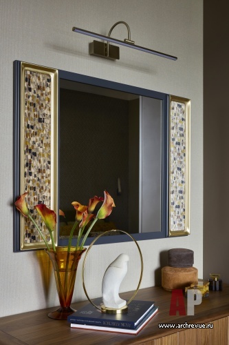Панели-буазери и мебель из шпона ореха, плитка-террацо, обои с тактильным эффектом, текстиль а-ля твид и костюмная шерсть, подушки с ручной вышивкой, антикварные светильники – все эти подробности формируют интерьер, который хочется и рассматривать, и трогать. «При выборе мебели было важно, чтобы она была удобная: заказчики – люди в возрасте, они сильнее чувствует эргономику. Правильная высота, возможность легко подняться с кресла и встать с дивана, не утопая в подушках – прежде чем заказать какой-то предмет, мы его «тестировали» на предмет комфорта», - рассказывает автор проекта. Если мягкую мебель выбирали долго и трепетно, но корпусную и вовсе частично изготавливали под заказ. Например, круглый столик для завтраков на двоих в зоне кухне и встроенный закрытый стеллаж с откидным секретером в гостиной. Живопись появилась в процессе комплектации проекта, заказчики так прониклись идеей оформить интерьер работами на тему старой Москвы, что вместе с дизайнером помещали аукционы и галереи. Не удивительно, что картины создают хорошее настроение, а сам интерьер выглядит так, как будто складывался годами и существует вне времени и моды.