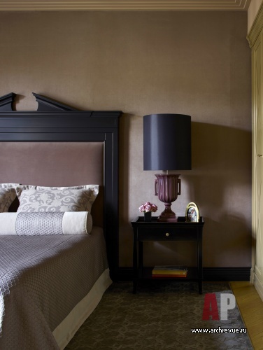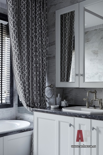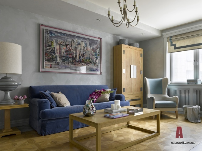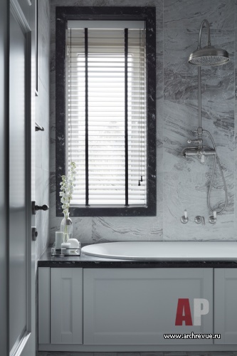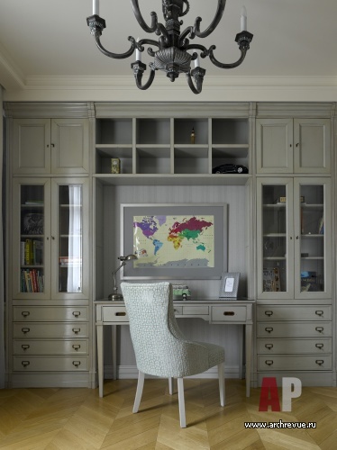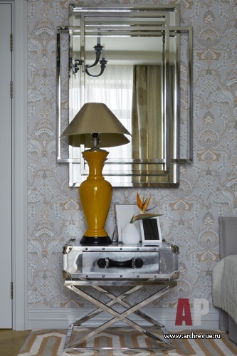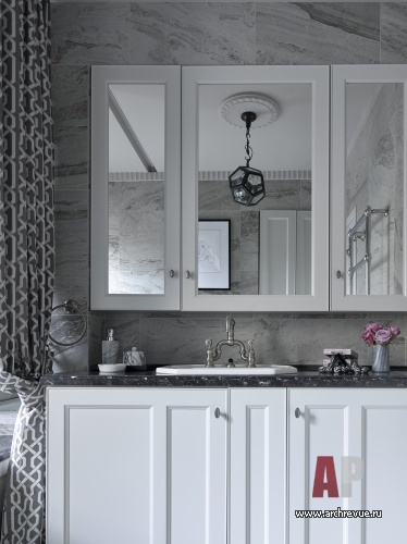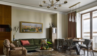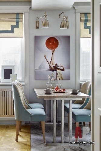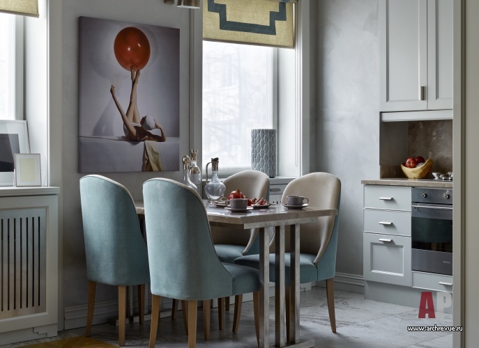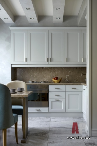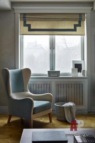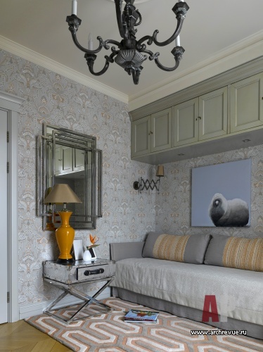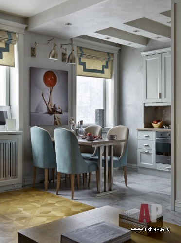 В хозяйской спальне ее сменяют обои из алькантары (их велюровая поверхность необычайно приятна на ощупь), в детской – бумажные обои с декоративным рисунком. Все мокрые зоны отделаны серым керамогранитом с фактурой мрамора: в разных помещениях варьируются варианты укладки, но сам материал неизменен. «Такой прием позволяет визуально объединить интерьер и лучше всего подходит для небольших пространств», - отмечает дизайнер. Двери и обрамление окон выполнены из дерева под светлой эмалью и ассоциируются с традиционными старомосковскими интерьерами. На полу уложен золотистый дуб под маслом (еще один реверанс в сторону классики). Особенно интересно выглядит половое покрытие гостиной: укладка щитового паркета напоминает декоративный ковер, по периметру он обрамлен каменными вставками. Интерьер близок к стилистике фьюжн. Например, в гостиной присутствуют восточные мотивы (шкаф и журнальный стол в гостиной), на кухне – элементы ар-деко (обеденный стол с каменной столешницей и основанием из латуни), в хозяйской же спальне и вовсе царит итальянская классика с характерной орнаментикой и плотными, обволакивающими цветами.