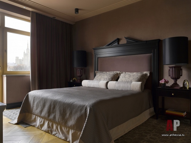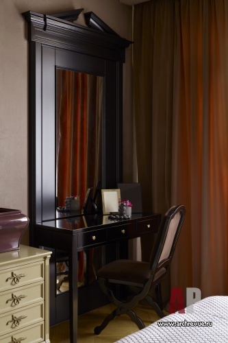 Спальня основание кровати и матрас King Koil, туалетный столик, стул, прикроватные тумбы Mis en Demeure, шкафы AM Classic