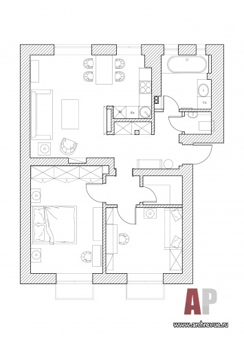 В ходе перепланировки дизайнер сохранила общую гостиную-кухню, но некогда студийные личные апартаменты разделила перегородкой на две спальни: обе комнаты получились удобными и просторными. При входе она сделала небольшую прихожую, а общий санузел разделила на две помещения: ванную комнату с окном и туалетную зону. В итоге получилась компактная и эргономичная квартира, в которой небольшая семья могла бы жить с комфортом постоянно.