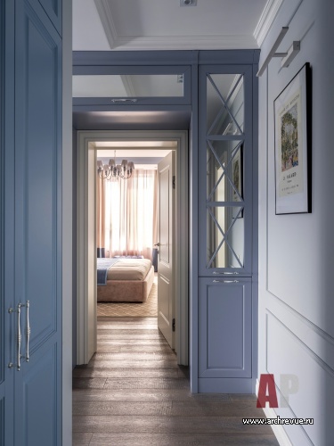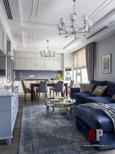 Интерьер выполнен в легкой классической стилистике с элементами традиционного американского дизайна и ар-деко. Основная его особенность – сложная серо-голубая цветовая гамма, почти монохромная: прохладная и освежающая она придает квартире необычайно элегантный вид