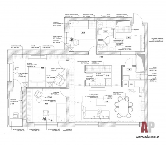 Квартира площадью 112 кв. м. расположена в монолитно-кирпичном доме, она изначально представляла собой большой прямоугольник, разделенный на две почти равные части несущей стеной с двумя проемами. На этой территории следовало разместить детские, родительскую спальню, гостиную-кухню, большую ванную комнату, гостевой санузел, постирочную и скрытые зоны для хранения.