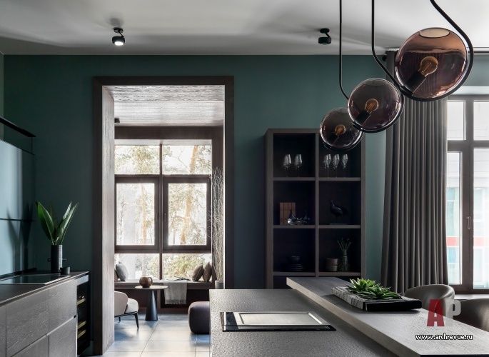 В интерьере квартиры дизайнеры гармонично соединили приглушенные тона, натуральные материалы и предметы современного искусства. Сама специфика загородной квартиры подтолкнула к идее экологичного интерьера: темный дуб под маслом с натуральной фактурой, природный камень, шерсть и лен в обивке мебели и декоре окон…
