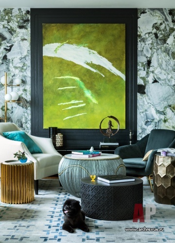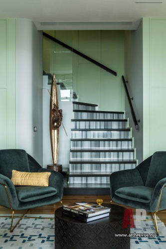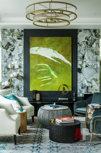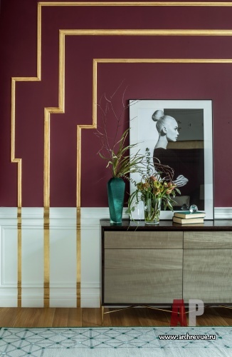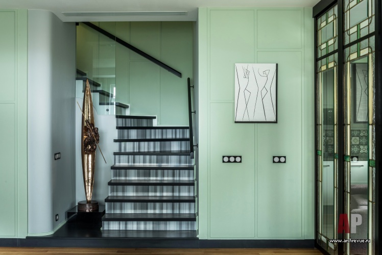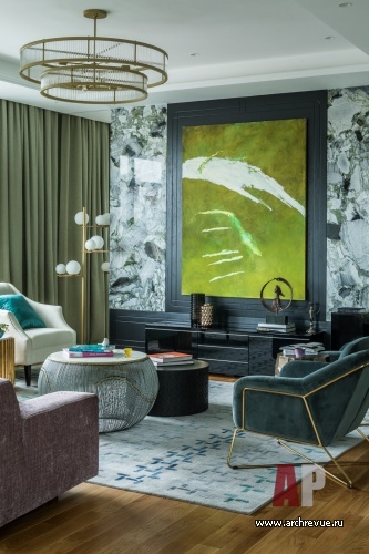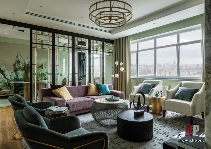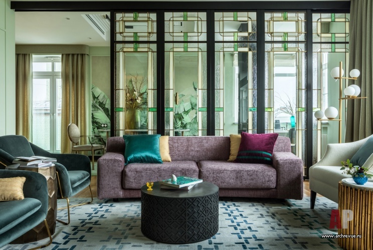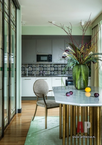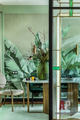 «Они мечтали об интерьере ярком, многоцветном, жизнерадостном, который бы компенсировал недостаток южного солнца и пышной растительности, - рассказывают авторы проекта. - Кроме того, им хотелось внести в интерьер цвета, материалы, орнаменты, которые ассоциируются с природой и помогают расслабиться в шумном мегаполисе. Мы предложили проект в нежных оттенках свежей зелени, с подробным декором и авторскими художественными изделиями в стиле ар-деко».