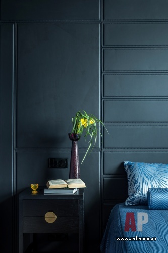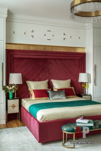 Спальня шкафы, прикроватные тумбы, стеновая панель и кровать с изголовьем изготовлены по эскизам дизайнера в компании Any Home; комод изготовлен на заказ компанией Enjoy Home