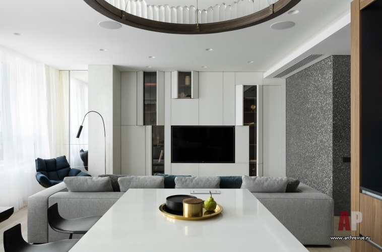 Гостиная диван и столик Minotti, кресло B&B Italia (модель Husk); система хранения, на заказ, по эскизам архитекторов