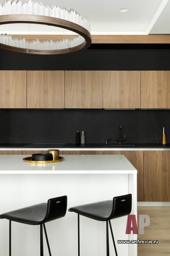 Интерьер выполнен в современном стиле с использованием натуральных, «честных» материалов: природного камня, дерева с живой текстурой, алькантары. Спокойный фоновый декор оживляют выразительные акценты: серебристая мраморная мозаика Porcelanosa, зеркала, кухня с фасадами из шпона американского ореха.