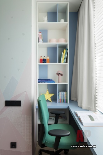 Детская комната кровати и рабочая зона, на заказ, по эскизам архитекторов; рабочие кресла Vitra, комод и полки Lago